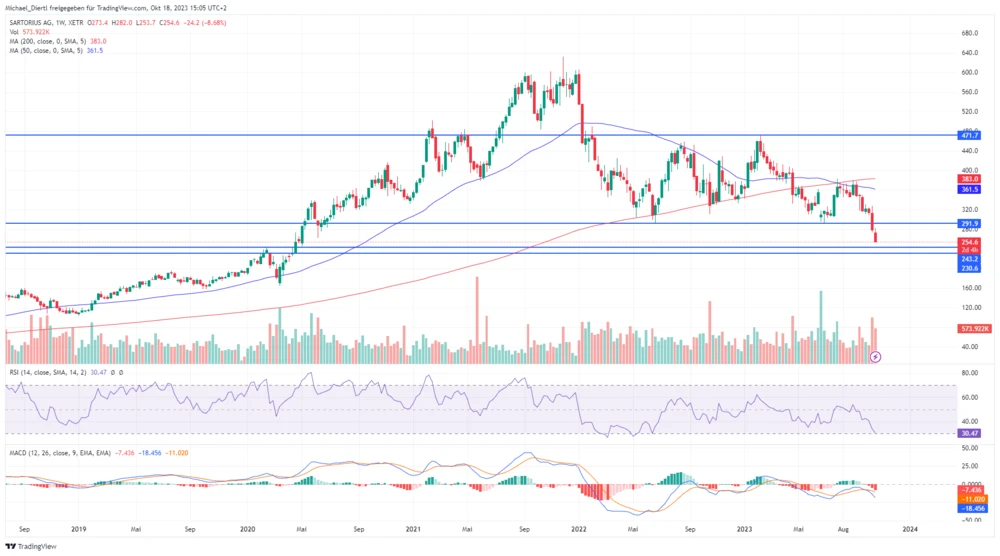 Sartorius-Aktionäre haben es derzeit nicht leicht. Binnen weniger Wochen brach das Papier massiv ein und markierte sogar ein Drei-Jahres-Tief. Doch der Absturz könnte noch weiter gehen, denn aus technischer Sicht ist die nächste signifikante Unterstützung noch ein deutliches Stück entfernt und bereits am Donnerstag warten die Q3-Zahlen.