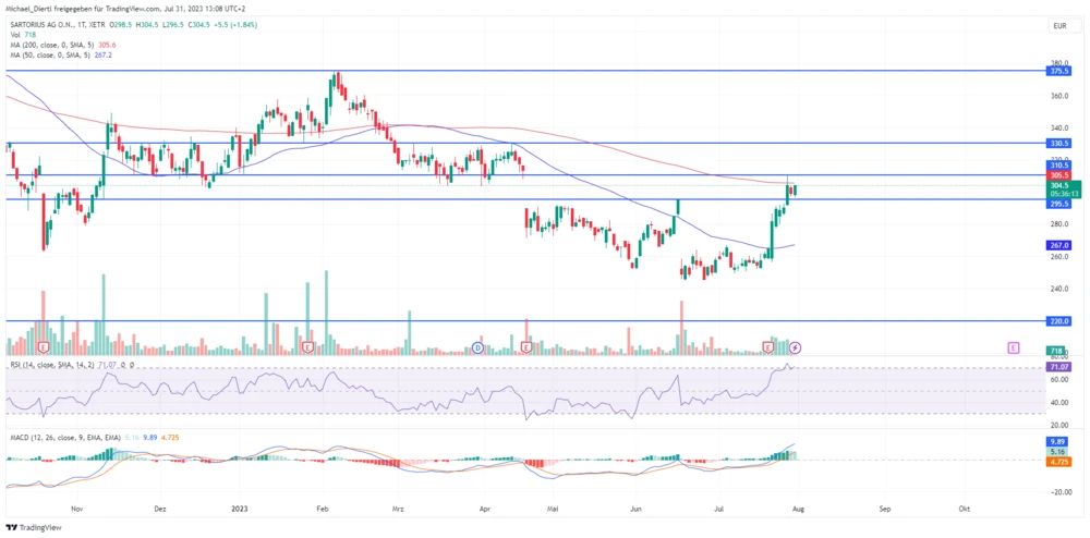Schon am vorvergangenen Freitag zeigte die Sartorius-Aktie erste Stärke und beendete den Tag mit einem Plus von 6,4 Prozent. Dabei übersprang sie den GD50, der aktuell bei 326,70 Euro verläuft, mühelos.
