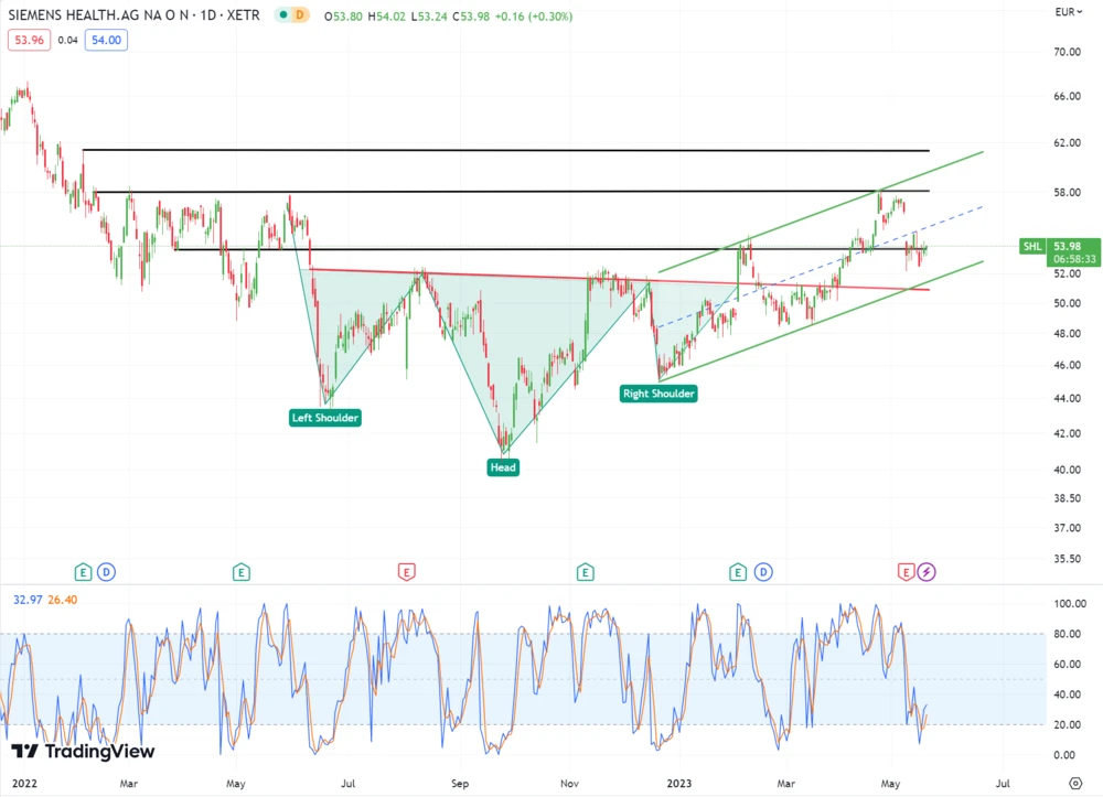 Sollte Siemens Healthineers es schaffen, die Horizontale bei 53,72 Euro hinter sich zu lassen, kann die Aktie relativ zügig in Richtung des April-Hochs bei 58,04 Euro steigen. Im Falle eines Ausbruchs über diese Marke sollte Siemens Healhineers bis zum Februar-Hoch 2022 bei 61,83 Euro ansteigen, was einem Kurspotenzial von etwa 13 Prozent entspricht.