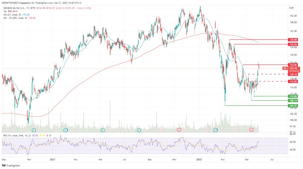 Wenige Tage nach Kriegsausbruch in der Ukraine fiel die Siemens-Aktie auf ein Mehrjahrestief bei 105,92 Euro. In den nachfolgenden Wochen starteten die Bullen mehrere Erholungsversuche, allerdings ohne nachhaltigen Erfolg.