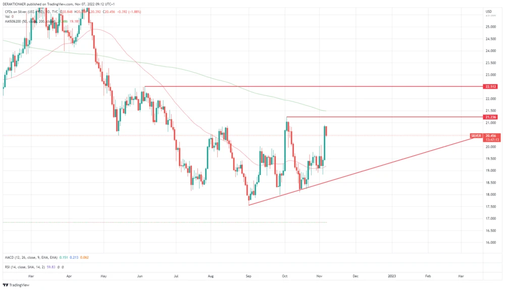 Fällt Silber nicht mehr unter die kurzfristige Aufwärtstrendlinie und verlässt die Seitwärtszone nach oben, dann sind Kurse im mittleren 20-Dollar-Bereich möglich.