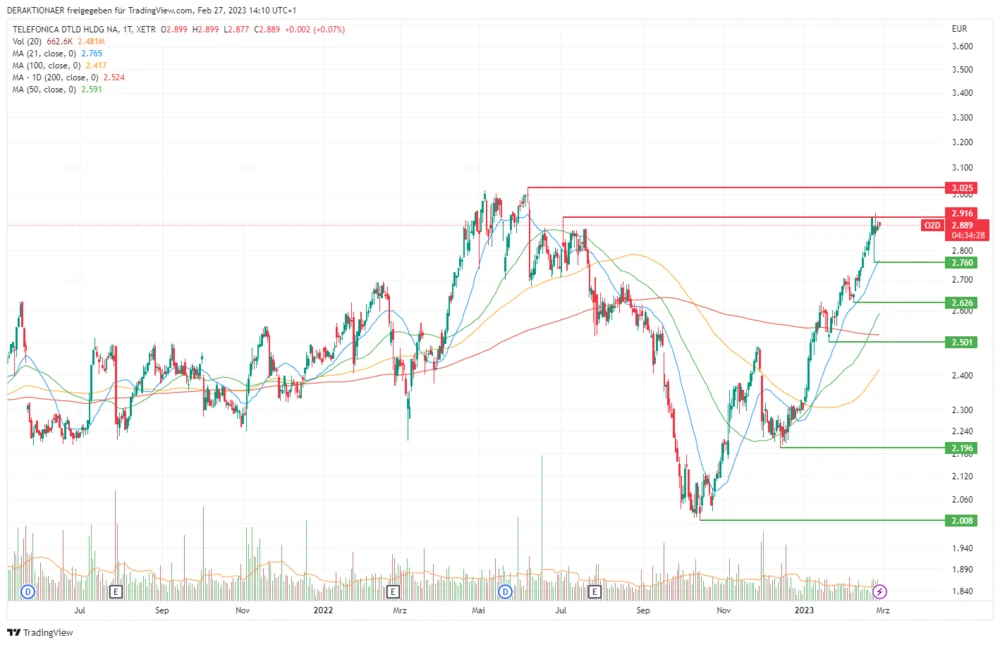 Die Telefónica-Deutschland-Aktie überzeugt mit einer starken Performance. Die Bullen sind auf dem Weg zum Mehrjahreshoch. Hier kann es zu kurzzeitigen Gewinnmitnahmen kommen, da aber das Momentum stark ausgeprägt ist, stehen die Chancen gut, dass auch diese Marke nur als weiteres Etappenziel bei der weiteren Erholung dient.