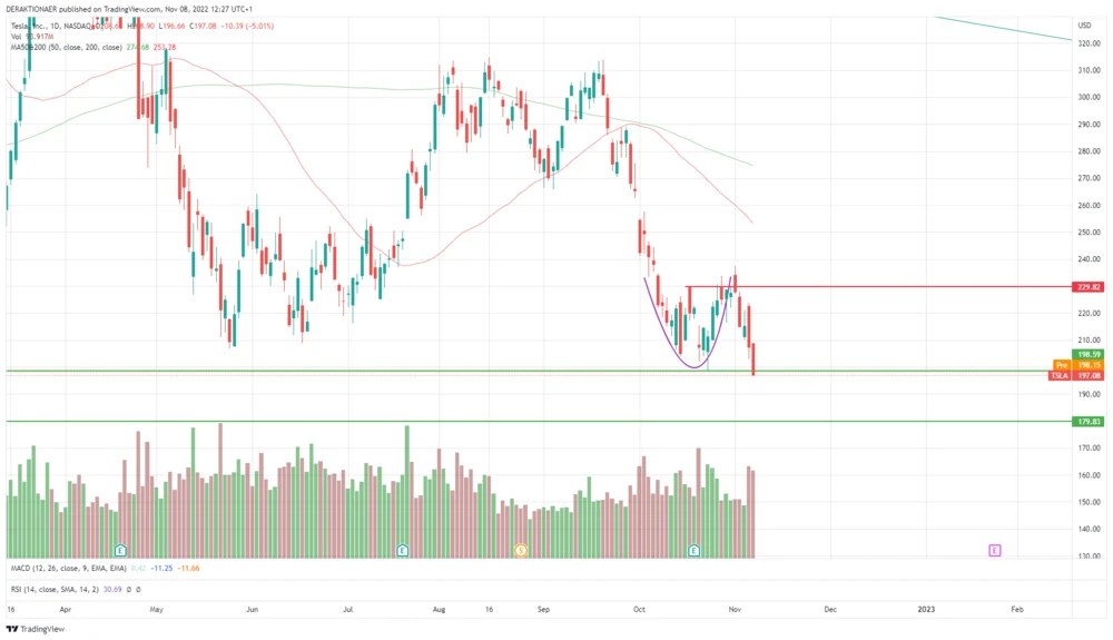 Am Montag unterschritt Tesla das Jahrestief bei 198,59 Dollar und erzeugte dadurch ein Verkaufssignal. Kurzfristig sollte deshalb der bearishe Trend fortgesetzt werden. Die nächste starke Unterstützung liegt bei 179,83 Dollar, dem Jahrestief aus 2021.