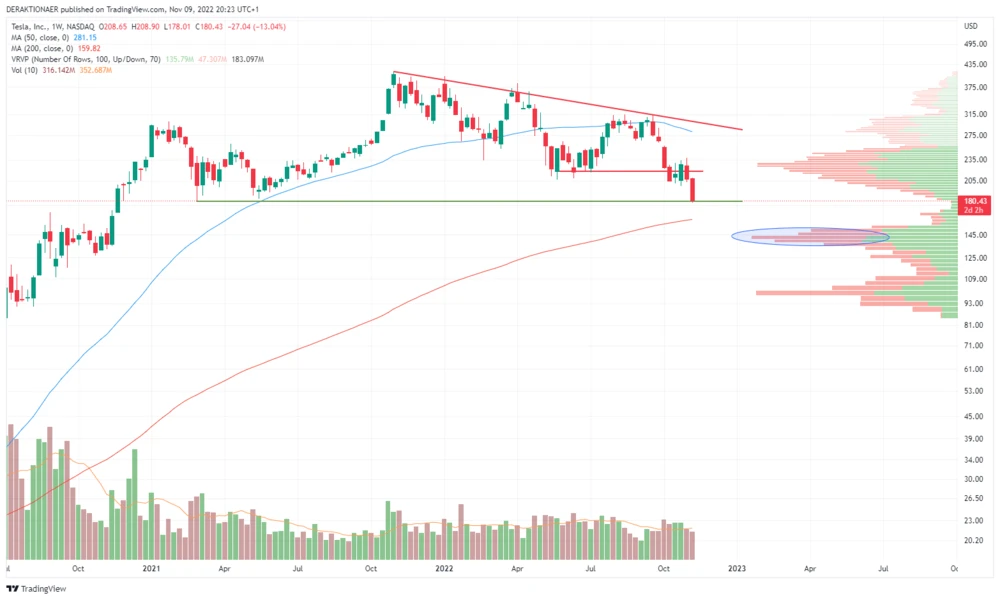 Der MACD-Indikator, der bereits unter der Nulllinie verläuft, hat sich dabei nach unten gekreuzt und damit ein weiteres Verkaufssignal ausgelöst. Doch am heutigen Mittwoch könnte es sogar noch schlimmer kommen: Die Aktie steht momentan exakt an der signifikant wichtigen Unterstützung am 2021er-Tief bei 179,83 Dollar. Durchbricht der Titel auch diese Marke, sind anhaltende Rücksetzer bis an den GD200 (im Wochenchart) bei 159 Dollar wahrscheinlich. Darunter rückt auf kurze Sicht das Volume-Peak bei 140 Dollar in den Fokus.