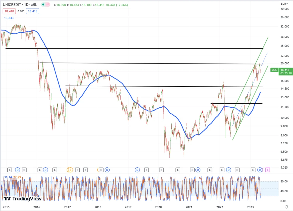 Für eine Fortsetzung des Aufwärtstrends spricht das Kaufsignal im Stochastik-Indikator, der aus der überverkauften Zone in die neutrale Zone zurückgekehrt ist. Zudem befindet sich die Unicredit weiter oberhalb der 200-Tage-Linie, welche die Aktie im Oktober 2022 erfolgreich nach oben durchkreuzt hat, was ebenfalls für steigende Kurse spricht.
