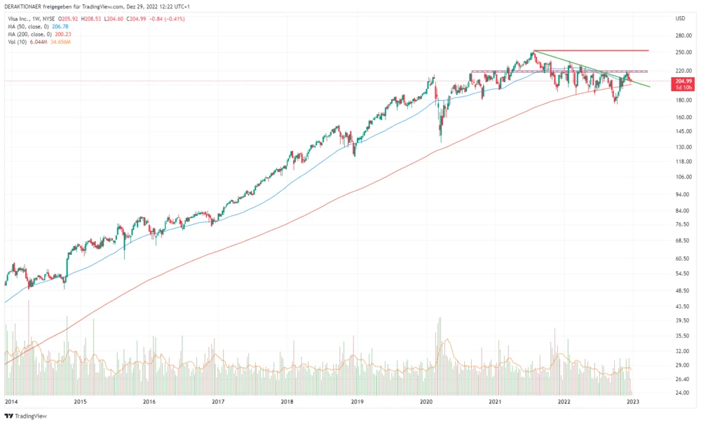 Nachdem die Visa-Aktie nach der beachtlichen Aufwärtsrally ein Rekordhoch bei 252,67 Dollar markiert hatte, konsolidierte sie in Form eines abfallenden Kanals. Im Oktober startete sie an der unteren Begrenzung bei rund 180 Dollar einen erneuten Rebound, wobei ihr diesmal während der Aufwärtsbewegung Ende November sogar der Ausbruch aus dem Abwärtskanal glückte.