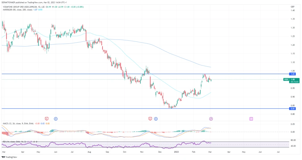 Bei 0,83 Pfund markierte Vodafone vor etwas mehr als zwei Monaten sein Verlaufstief. Seitdem stieg der Kurs um circa 20 Prozent und eroberte sogar den GD50 als Unterstützung zurück.