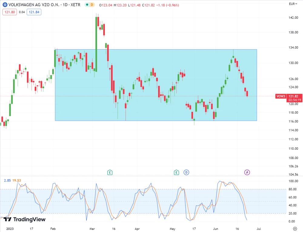 Volkswagen notiert seit Februar in einem Seitwärtskorridor. Letzte Woche hat die Aktie versucht, sich aus den Fesseln der Range zu befreien, doch die Horizontale bei 133,48 Euro erweist sich bisher als hartnäckig.