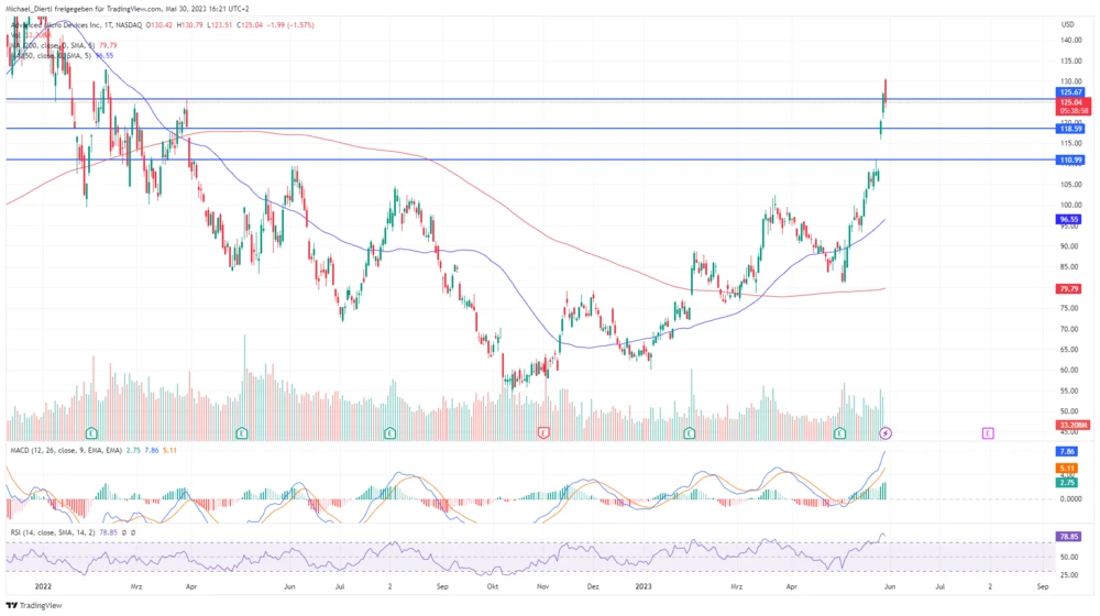 Dadurch markierten die Papiere von AMD ein neues Jahreshoch und schlossen zudem das Gap bei 118,59 Dollar. Wie erwartet erreichte AMD infolgedessen das März-Hoch 2022 bei 125,67 Dollar und somit das Ziel des Trades. Der bei 3,31 Euro empfohlene Schein mit der WKN VU2J3V legte auf über 5,00 Euro zu.