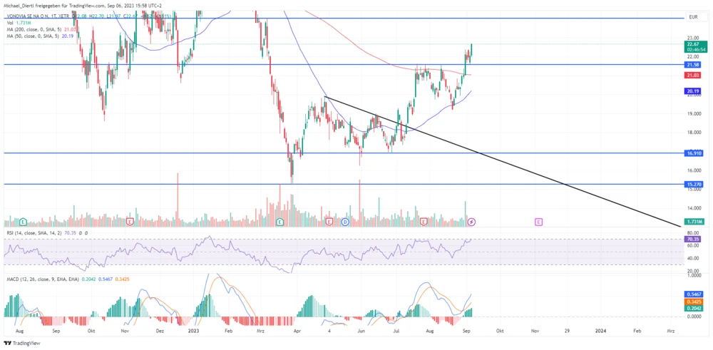 Auch aus charttechnischer Sicht hat das Papier noch Platz nach oben. Denn weder der RSI noch der MACD-Indikator befinden sich auf einem stark überkauften Niveau. Das März-Hoch bei 24,02 Euro sollte Vonovia deshalb ohne größere Zwischenkorrektur erreichen können.