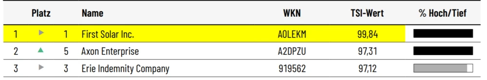 Im TSI-USA-Depot ist ein Midcap-Platz zu vergeben. Die Bedingung: Die Aktie muss über eine äußerst hohe Trendstärke verfügen. Auf diese Weise stellt das Team rund um Stefan Sommer sicher, dass sich der Zukauf genauso erfolgreich entwickelt wie zuletzt First Solar. Seit ihrer Aufnahme vor zwei Monaten hat die Aktie des Photovoltaik-Spezialisten Lesern bereits 20 Prozent Gewinn beschert.