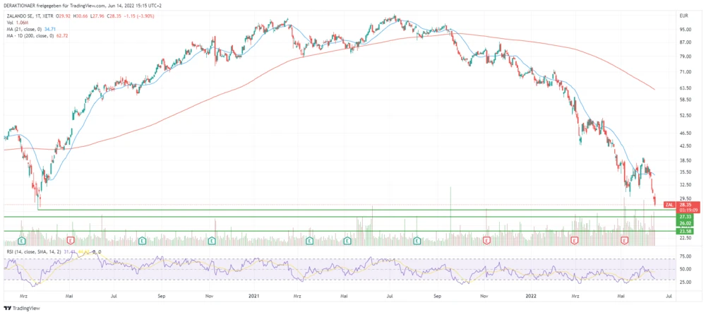 Vom Allzeithoch vor rund einem Jahr bei 105,90 Euro hat sich die Zalando-Aktie immer weiter entfernt und notiert inzwischen 72 Prozent tiefer. Nun droht sogar noch ein weiterer Rücksetzer, da sich der Titel immer weiter einer wichtigen Unterstützung nähert.