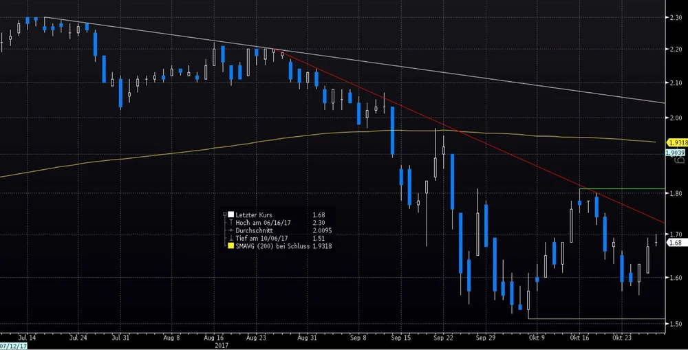 Alpha Bank -Kurs muss über Okt.-Hoch bei 1,80 €, vor allem über 200TL bei 1,95€ zur Abwärtsl. seit Juli bei 2,05€. Abs.: Okt.-Tief bei 1,50€
