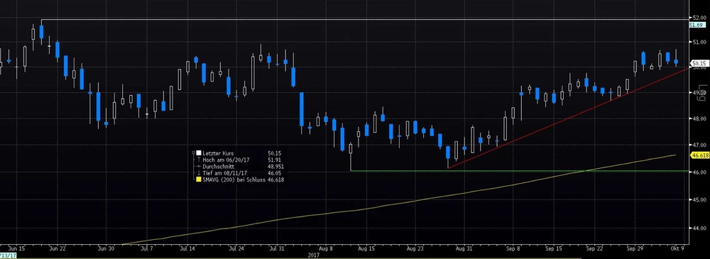 Fuchs Petrolub -Kurs muss über das Rekordhoch von Juni bei 51,90 €. Absicherungen: Aufwärts seit August bei 49,70 €, 200-TL bei 46,60 €.