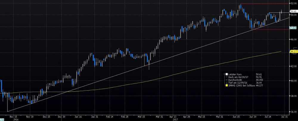 Fuchs Petrolub Vz-Kurs muss nachhaltig über Juli-Hoch bei 50,40€ zum Rekordhoch bei 51,90€. Abs.: Aufwärtsl. bei 49,15, Juni-Tief bei 47,60€
